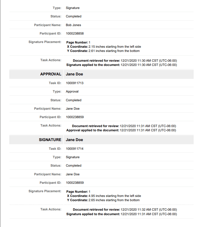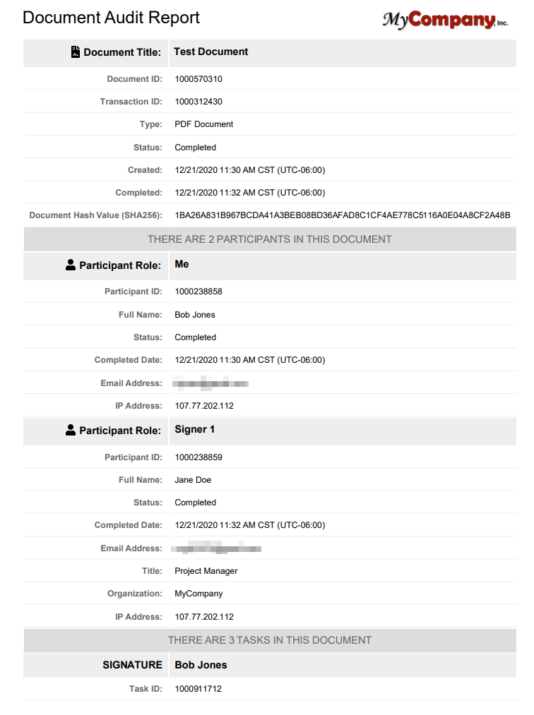 - Establishing a chain of custody over the document such that it may be proven during a future dispute or compliance audit that the audit trail (shown in the Document Audit Report) was recorded and that the document has not been tampered with or altered in any way since signing.