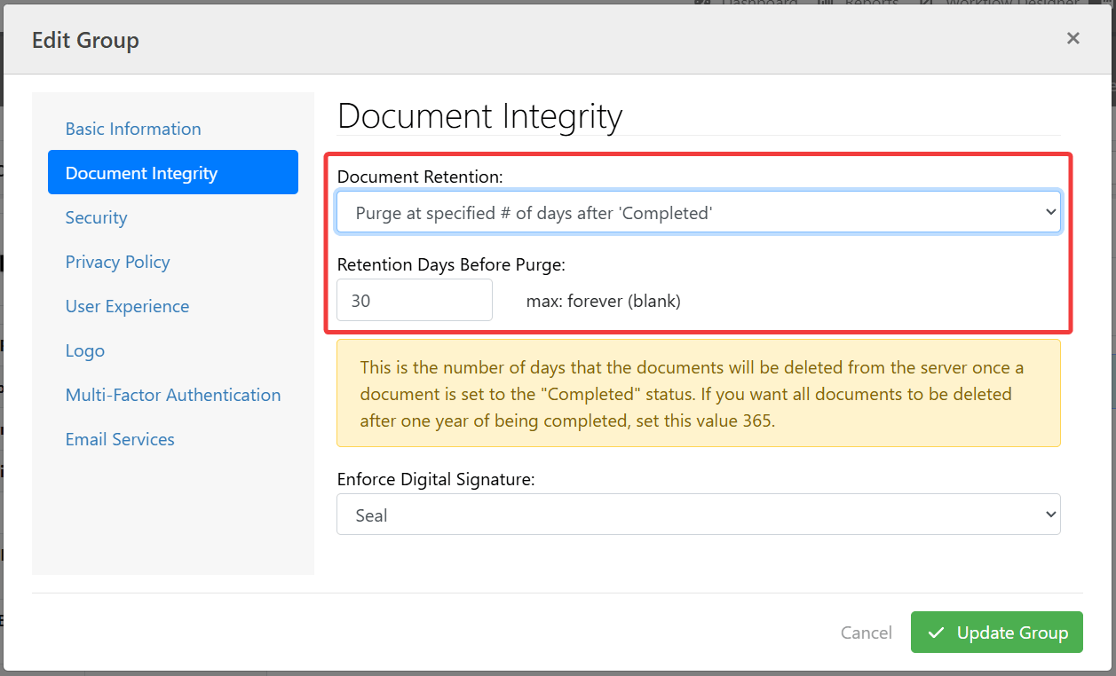 DeleteDateproperty. Once a Transaction is completed and the Document'sDeleteDatehas been passed, all files pertaining to that document will be deleted. - Group-Level: If the Transaction-level